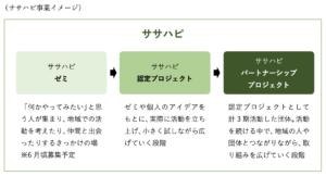 ササハタハツまちラボでは、市民共創プロジェクトの支援を行う「ササハタハツピープルまちづくりサポート(ササハピ)」事業を展開し、延べ 60 のプロジェクトの支援を行ってきました。令和6年度からは、ササハピ事業をさらに発展させるため、これまでの「認定制度」に加えて、新たな仕組みを創設しました。(事業イメージをご覧ください)