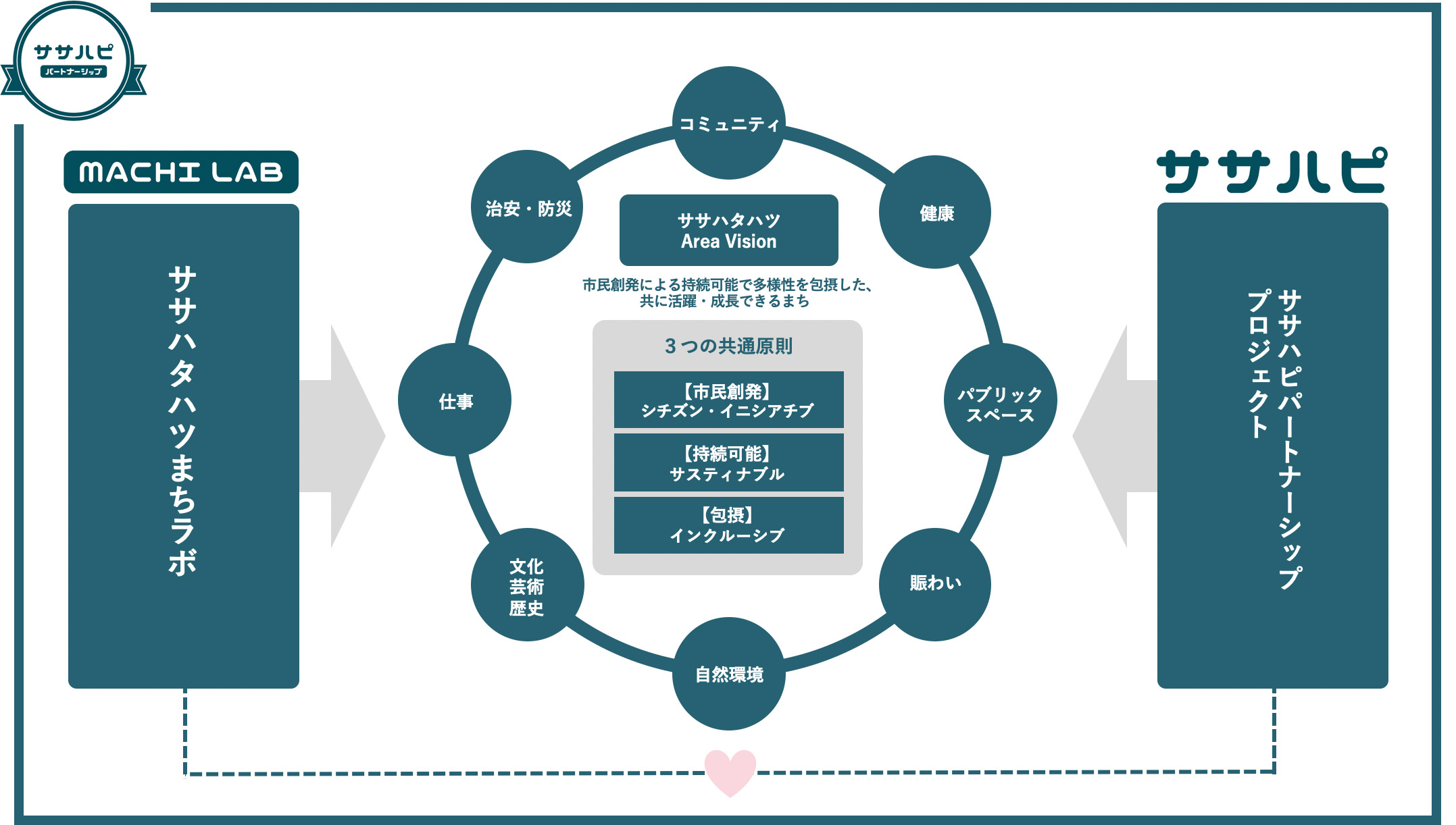 ササハピ認定プロジェクトとして計3期以上活動しその実績をまちラボが認めた団体とまちラボがササハピパートナーシップ協定を締結し、互いに協働して、ササハタハツエリアの暮らしの質及びまちの魅力の更なる向上に取り組むことを目指す制度です。